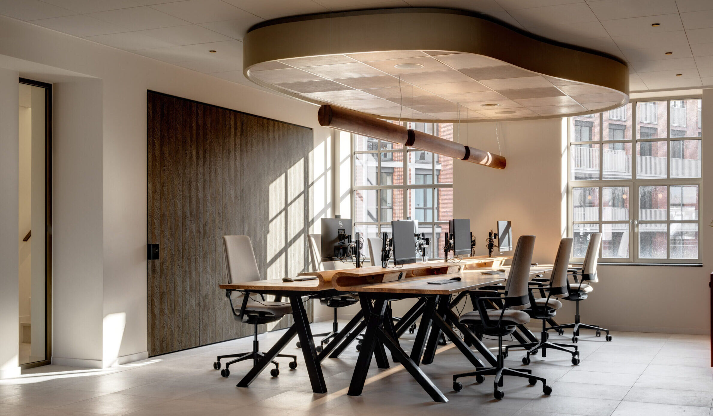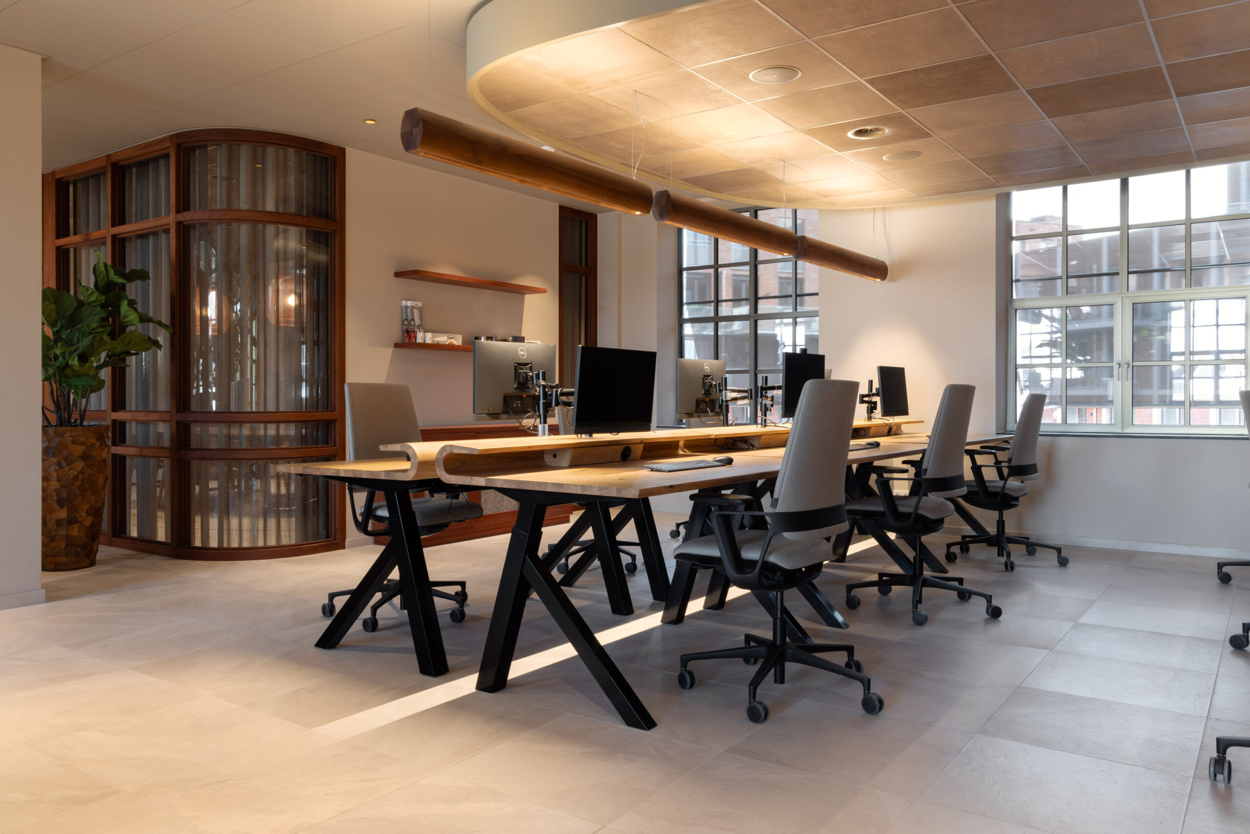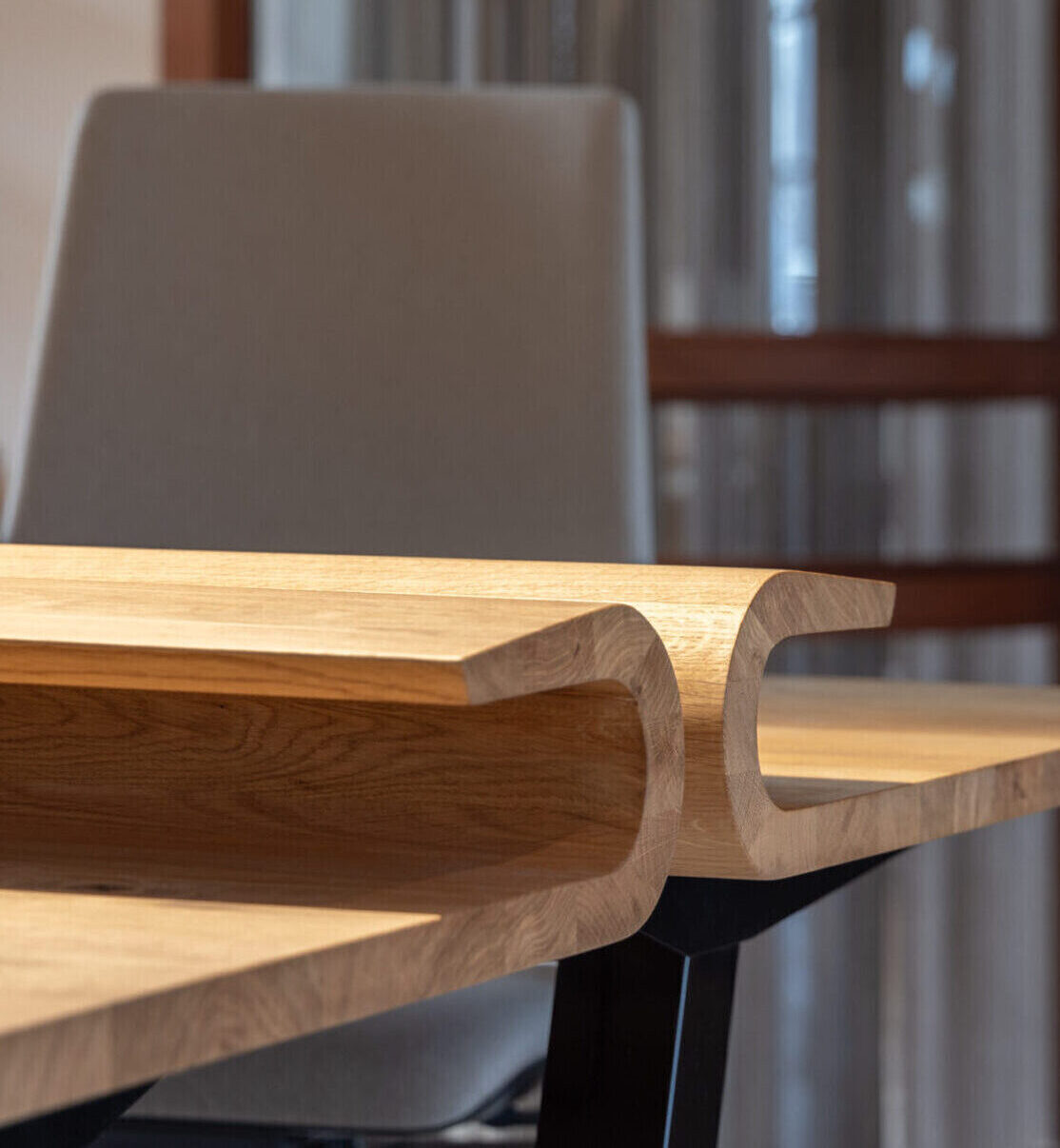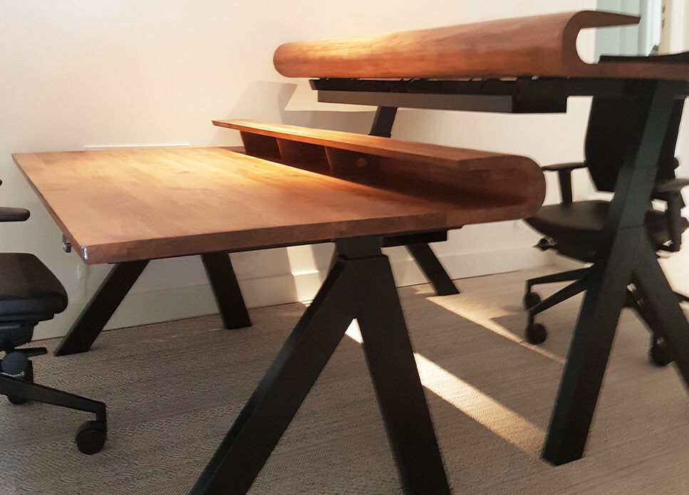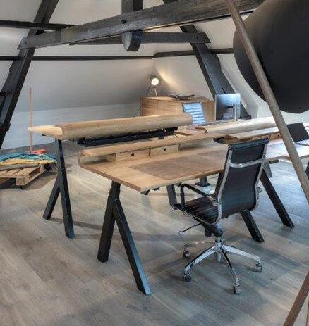 With a curve that grasps your attention instantly and a slick wooden surface Bent distinguishes itself from other desks. In addition Bent supports slanted legs in polished black. Adjustable in height and available in oak, elm and European walnut it fits perfectly in almost any interior. Whether it’s at home or in the office Bent is a comfortable and natural desk that is highly suitable for both sitting and standing work. Last but not least, you can finish it with an optional Alphenberg leather inlay of your choosing.