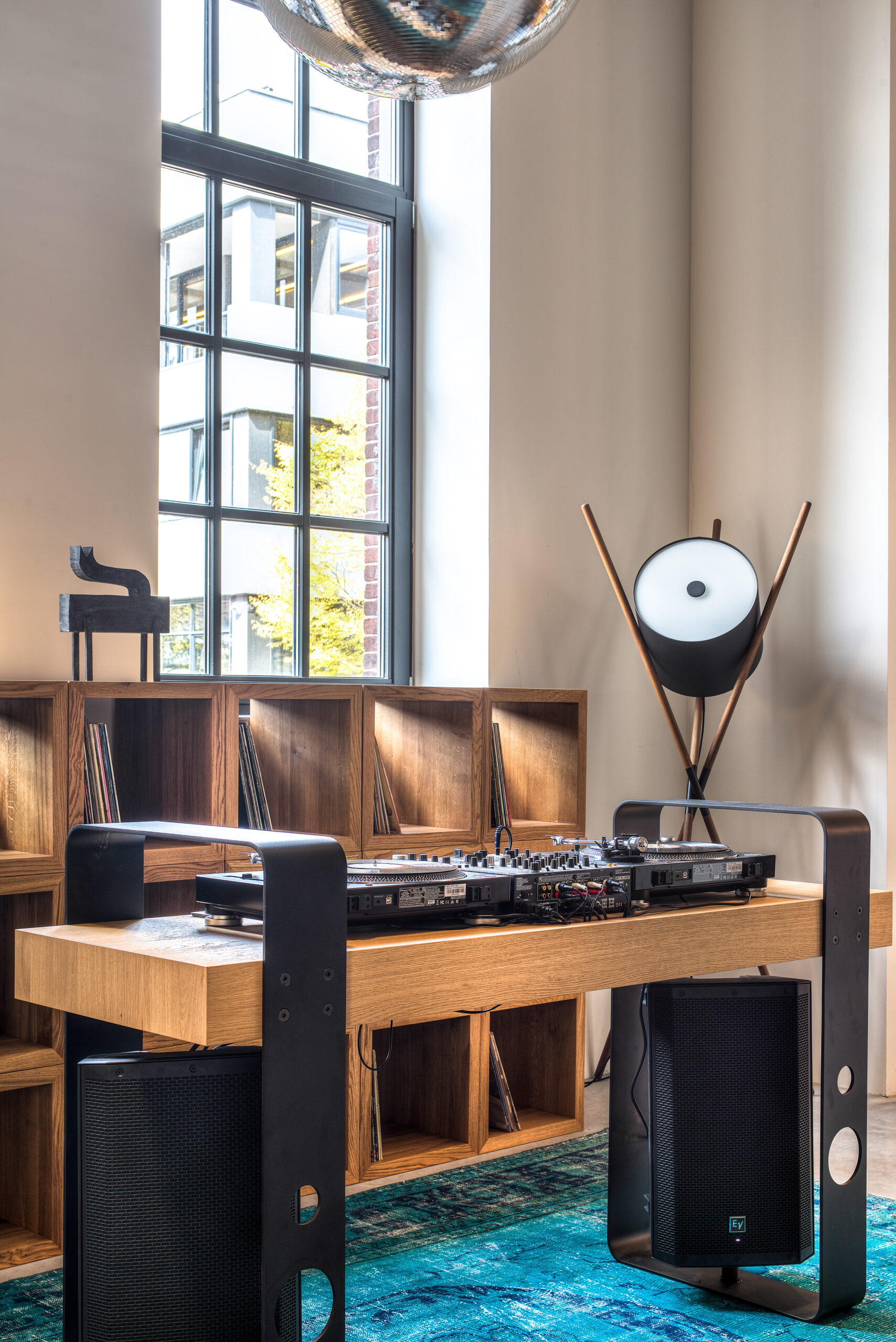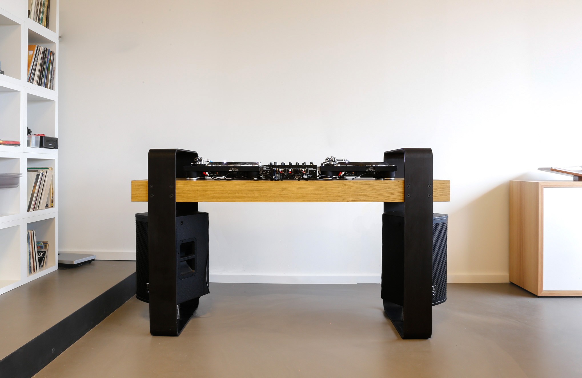The simple but striking combination of coated steel and genuine oak is what makes the Vinyl Booth DJ Booth stand out. Rather than hiding its electronics, Soundblast showcases them. From the stand-alone speakers on the sides to the mixer and record players on top; they all add up to a DJ Booth designed by and for music lovers.