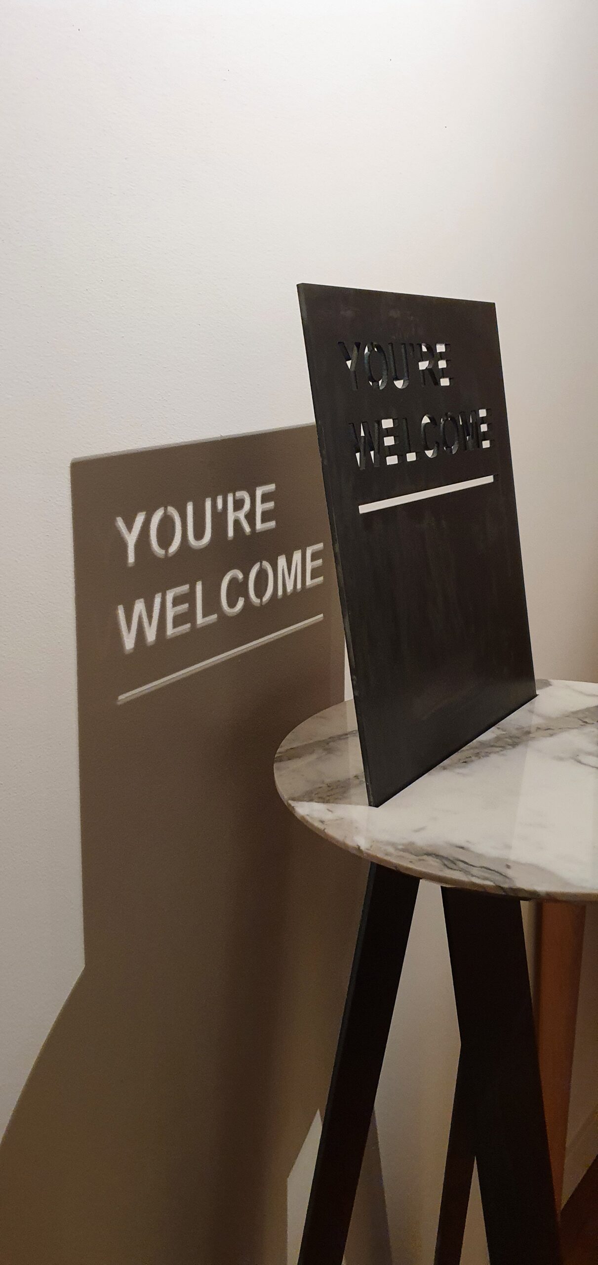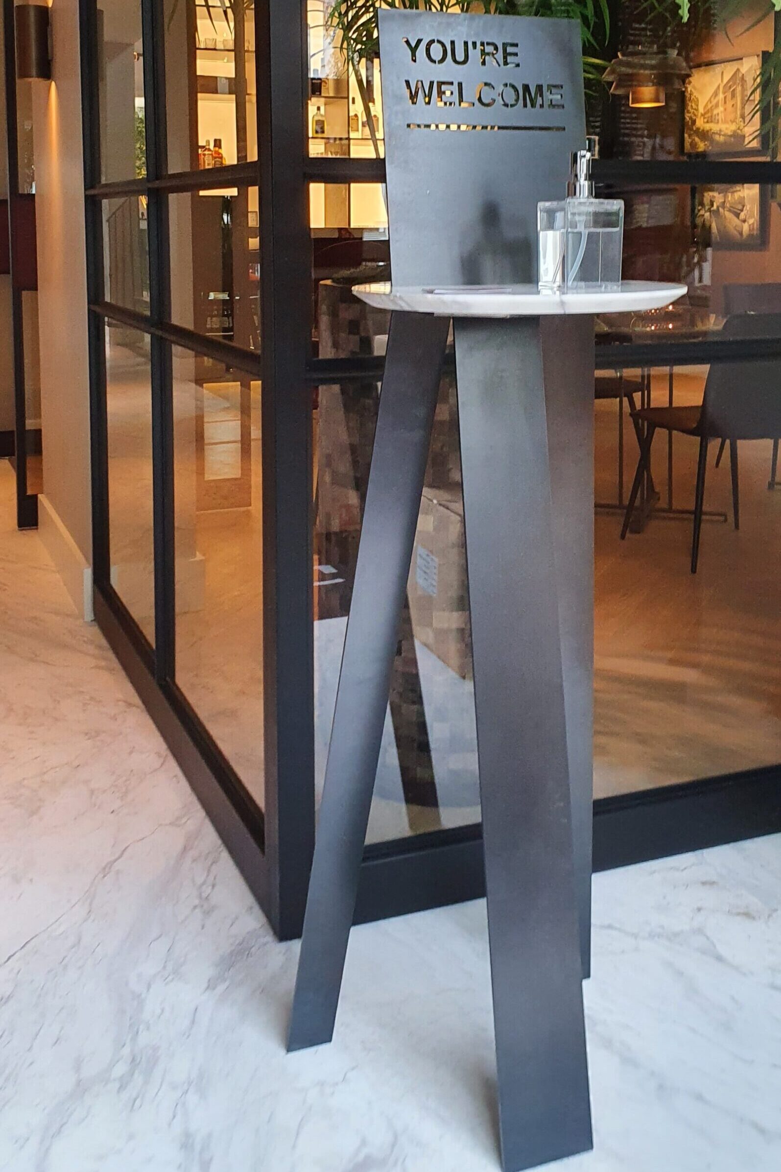You’re Welcome is here to give you a warm welcome. Whether you want to rub some alcohol on your hands or take a business card, the You’re Welcome is an elegant and functional multipurpose holder for your office or even your home. Created with plain carbon steel and a leftover piece of marble, every You’re Welcome is unique and almost entirely circular. Tough steel meets luxury marble: a combination that is both modern and stylish.